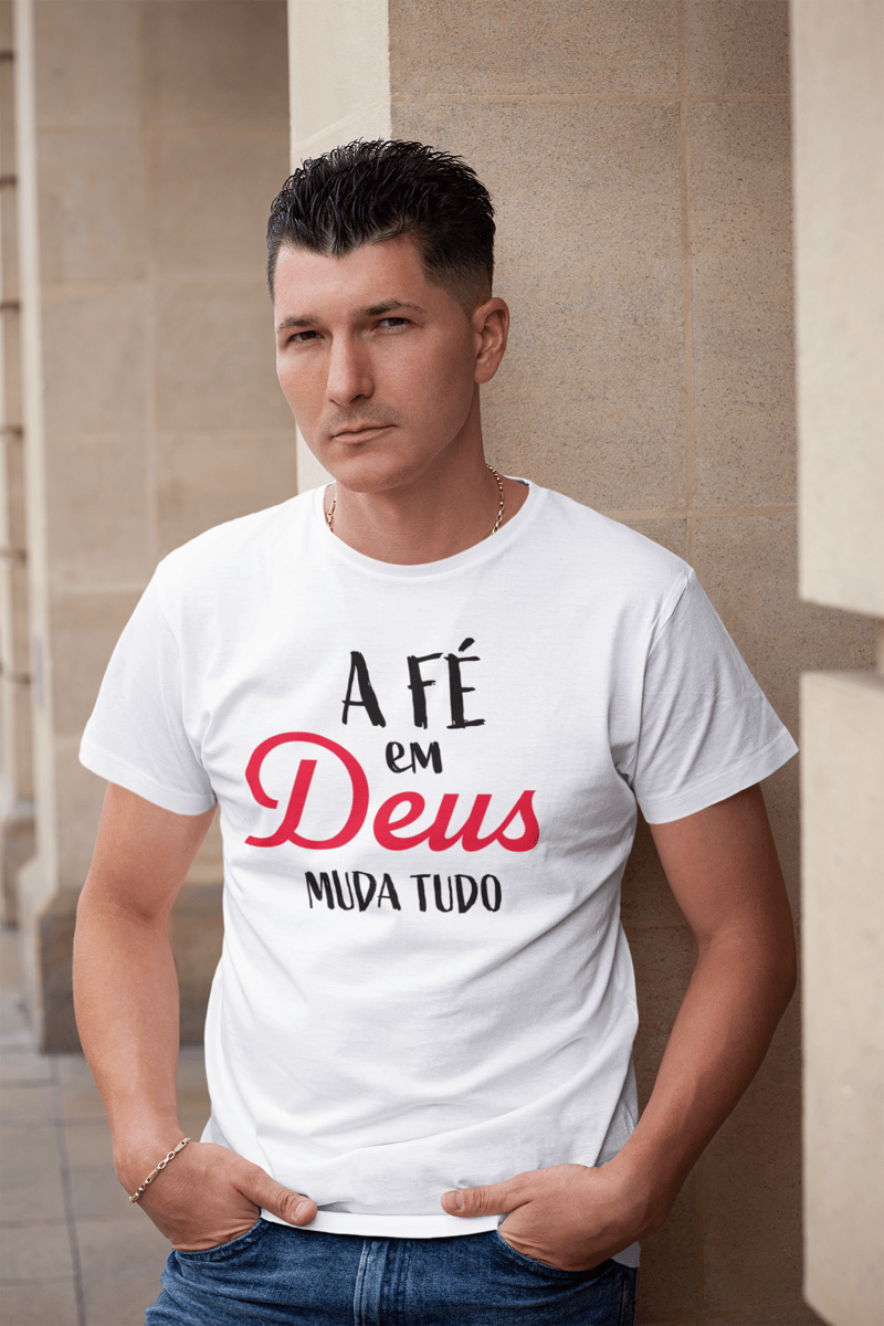 Camiseta quality masculina "A fé em Deus Muda Tudo".