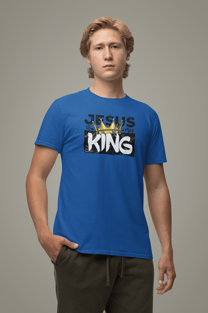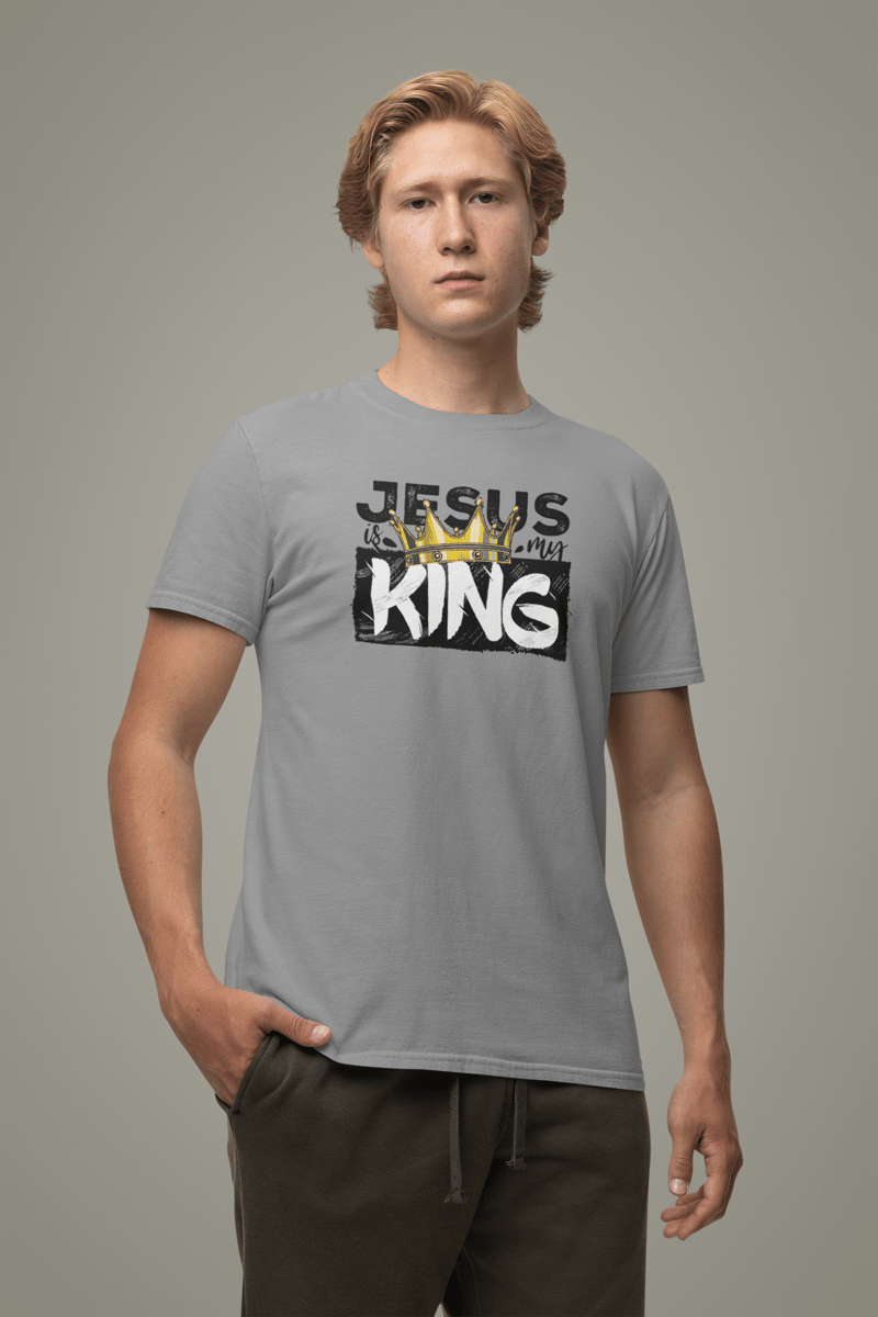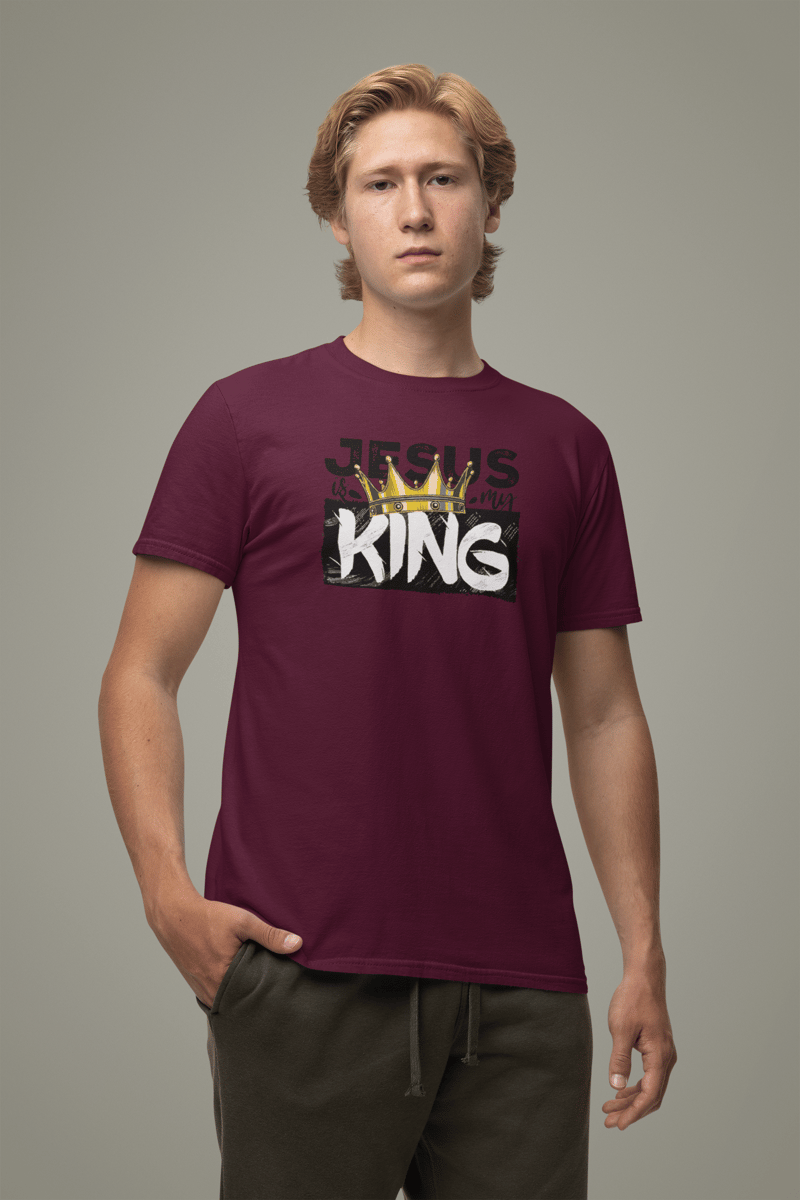 Camiseta Quality masculina com a frase "Jesus is My King", com uma coroa em primeiro plano.
