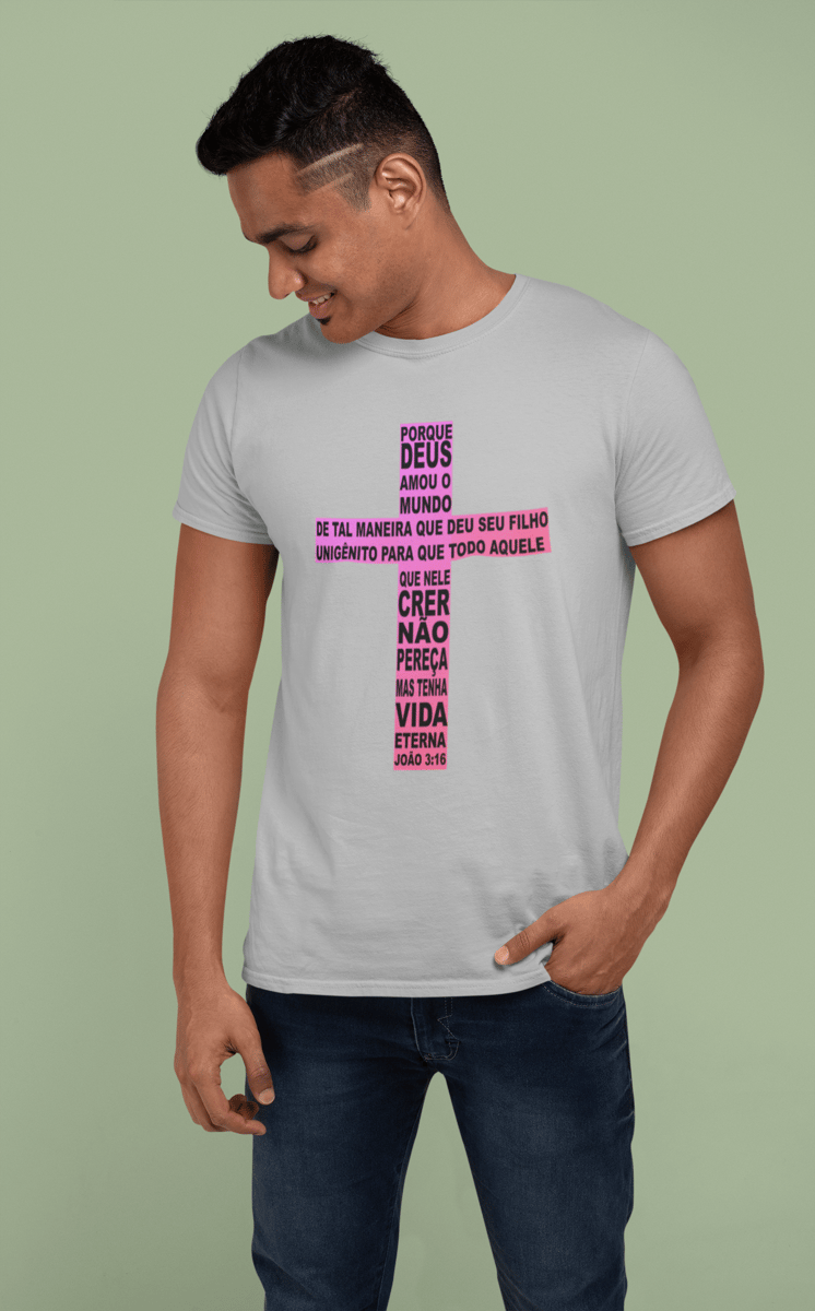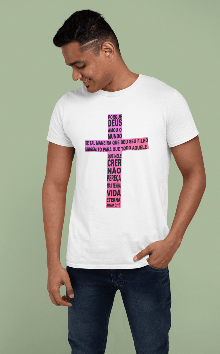 Camiseta masculina quality, com o versículo de João 3:16, dentro de uma cruz.