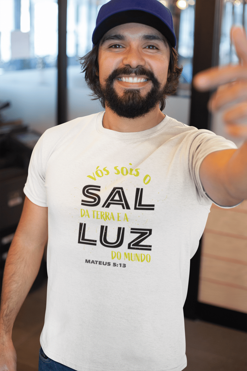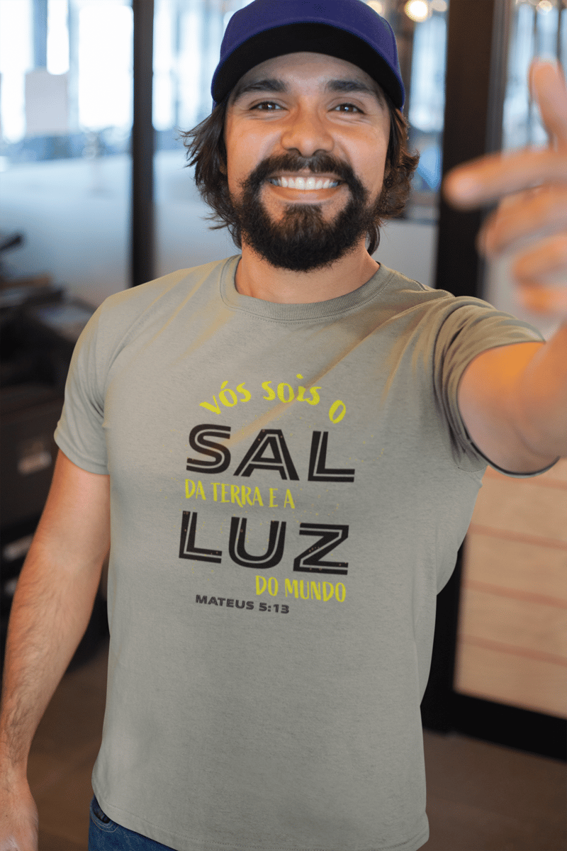 Camiseta quality masculina "Vós Sois o Sal da Terra", com escritas nas cores preta e amarela.